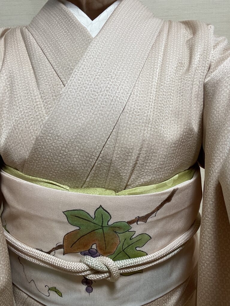 自宅の洗濯機で洗えるきものですが、袋帯を締めればややフォーマルに着られます。