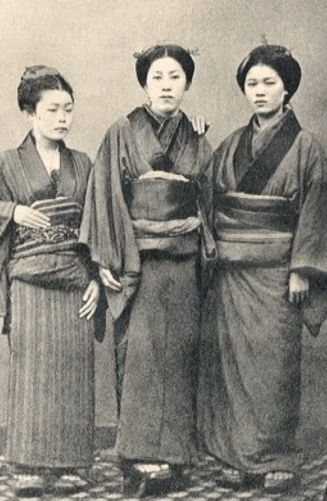 この着方に興味を持ったのは、NHKの朝ドラ「ばけばけ」のきものの着方です。長襦袢の半襟の出ている量がとても多いのです。今の着付けでは考えられないくらい沢山出ています。しかし、明治時代はこんな様子だったようです。
