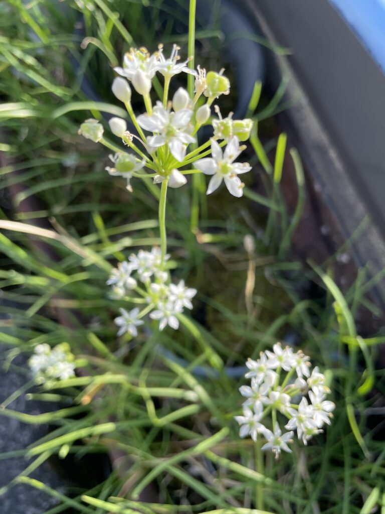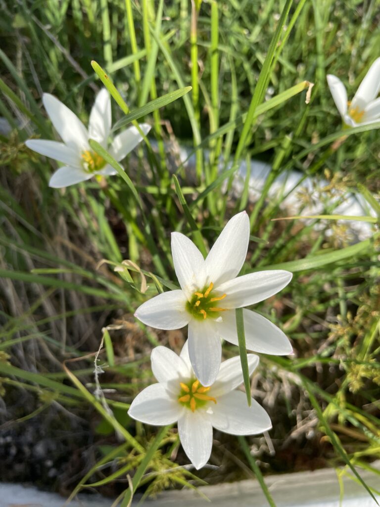 上の写真は花は「タマスダレ」というそうです。にらの隣に咲いていました。