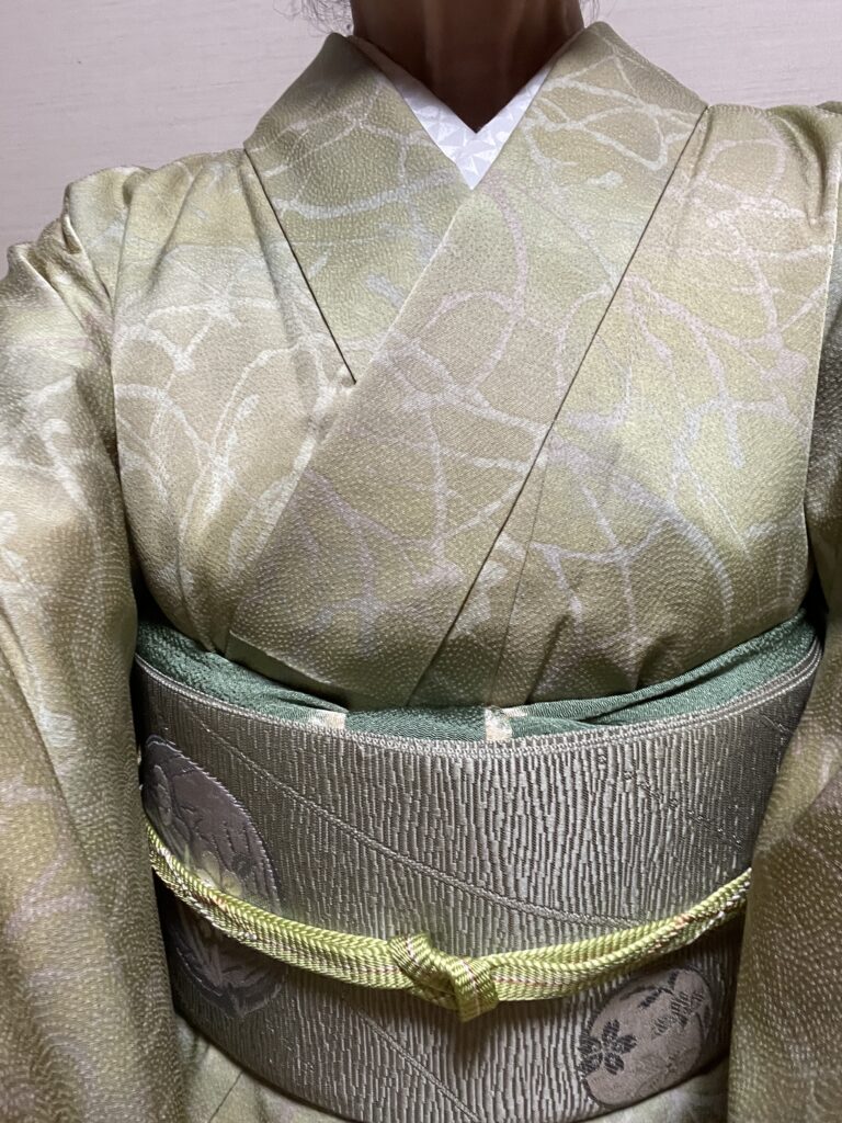 帯は博多帯です。八寸(袋名古屋)です。袋名古屋帯は芯を入れずに耳をかがって仕立てています。