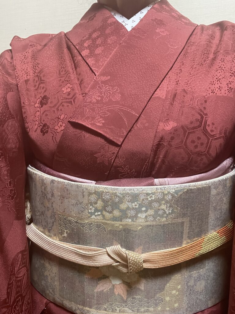 帯は、何度も登場していますが、袋帯だったのですがお太鼓柄で柄が出にくく結びにくいので名古屋帯に仕立て直してもらったものです。それからはよく使うようになりました。