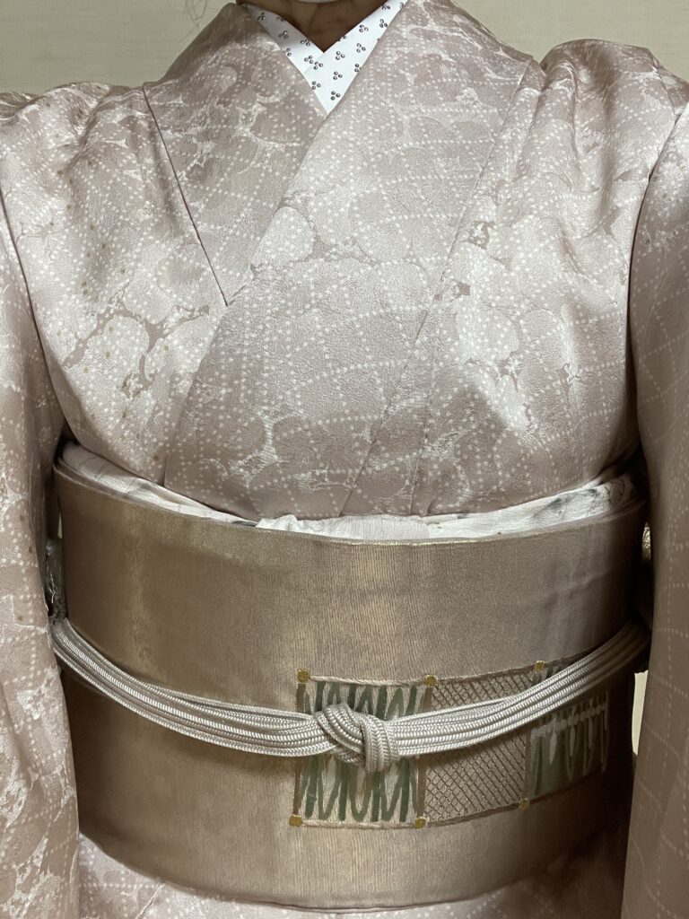 小紋のきものですが、光沢のある生地で柄の雰囲気も無地っぽいのでややフォーマルの感じで着られます。