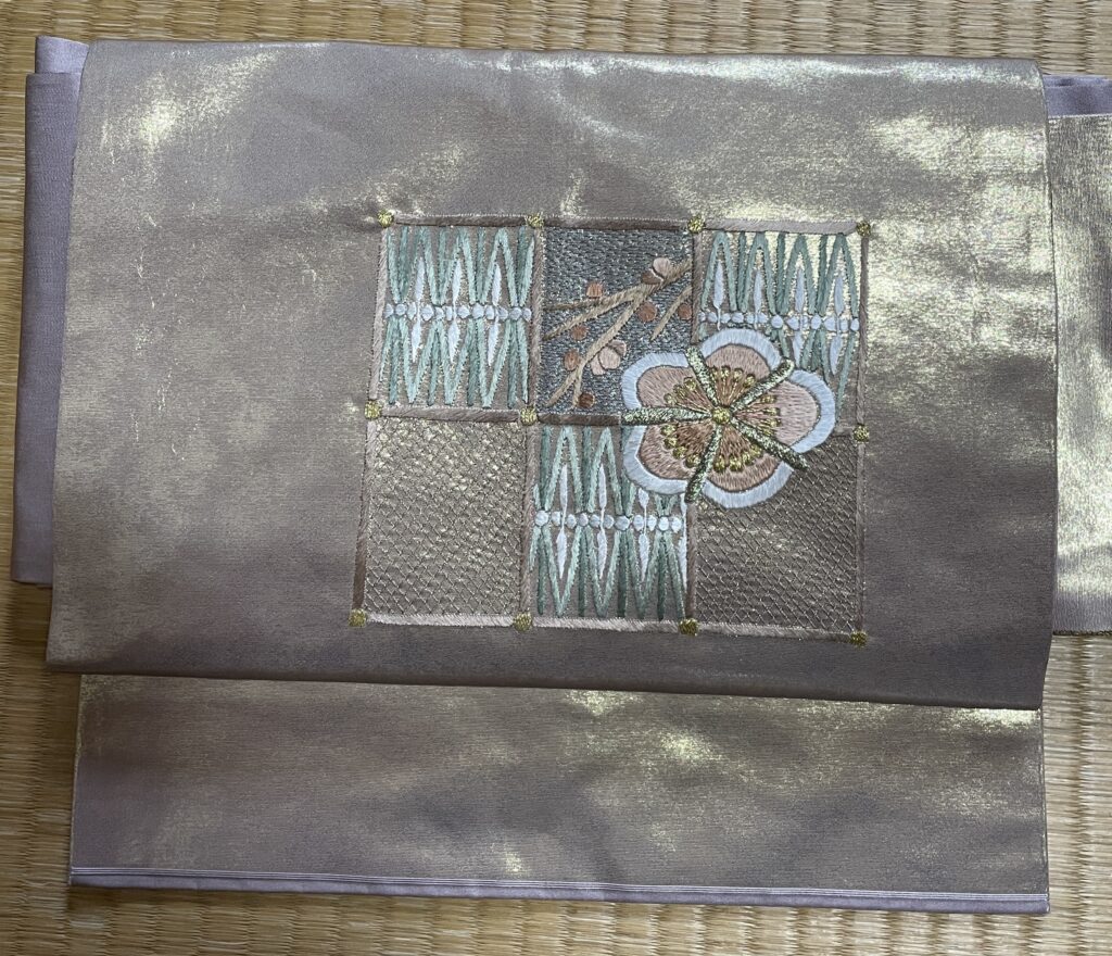 この帯もお太鼓柄から下が長くて立ち上がりが多くて形をつりにくいのでお太鼓柄から下で縫っています。