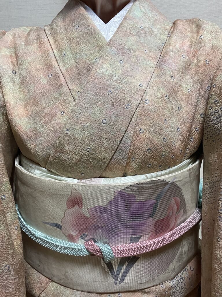 帯はお気に入りの螺鈿の「欄」の柄の名古屋帯です。お太鼓柄なのでとても柄が出しにくくて結びにくいので途中で継ぎ足しています。これでバッチリ結びやすくなりました😂😂🤣
